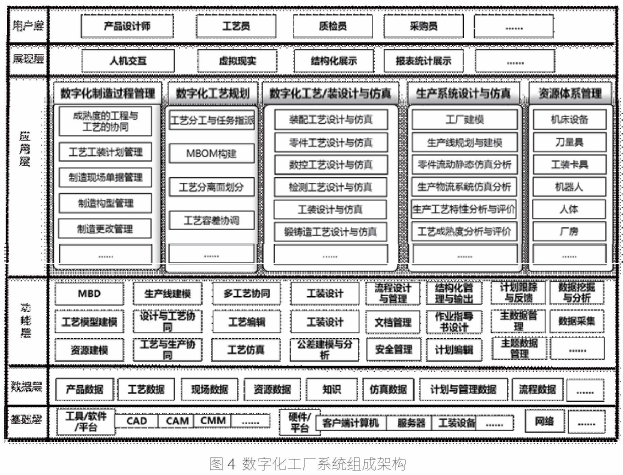 ( 5 ) 基础能力体系。主要包含数字化工厂的流程、 工具、 方法、 数据、资源、知识管理和分析,并通过集成形成的数字化工厂环境。